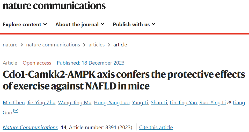 2023年12月18日,Nature Communications刊发ok138cn太阳集团慢性病运动康复创新团队郭亮教授课题组题为《Cdo1-Camkk2-AMPK axis confers the protective effects of exercise against NAFLD in mice》的研究论文。