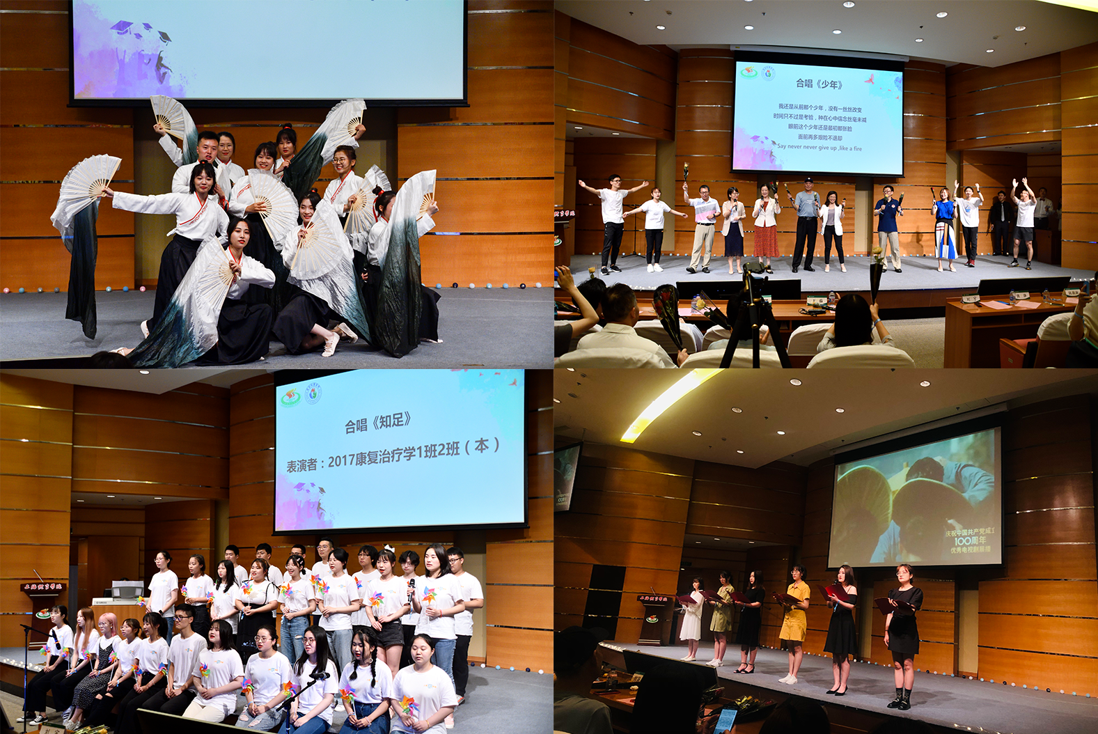 17运动康复本科班带来的古典舞《华夏》将对五千年中华文明的赞颂与热爱融入到了优美动人的舞蹈中;博士毕业生王淼带来的个人独唱《爱拼才会赢》深情诠释了运科人拼搏向上、追求卓越的精神;18运动康复硕士班用诗朗诵《青春》表达了“百年大党风华正茂、百年初心历久弥坚”的赤子之心;17康复治疗本科班带来的合唱《知足》以悠扬的歌声把大家的思绪拉回到了过去的美好回忆里;17级本科生带来的小品《如何是好》通过幽默反讽的喜剧手法,批判了不懂业务、一心媚上的不良职场现象,诠释了坚守初心的重要性;17运动人体科学本科班带来的《弹力套子舞》让大家开怀大笑;18级研究生带来的诗朗诵《春暖花开》、歌曲《明天会更好》表达了对未来的美好憧憬;一首师生合唱、互动献花的《少年》将典礼推向了高潮……