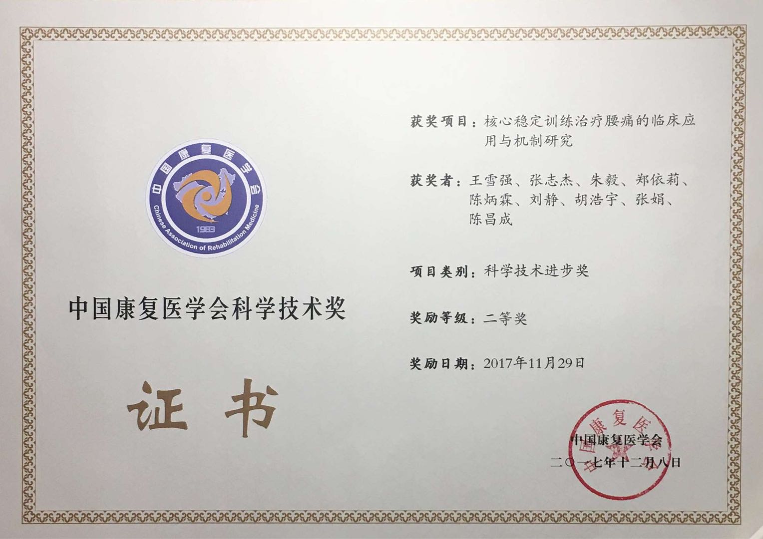 12月8日晚上,2017年度首届中国康复医学会科学技术奖颁奖典礼在北京国家会议中心举行,中国康复医学会方国恩会长亲自为获奖者颁奖。我校王雪强博士团队完成的“核心稳定训练治疗腰痛的临床应用与机制研究”获科技进步二等奖。主要完成人为:王雪强,张志杰,朱毅,郑依莉,陈炳霖,刘静,胡浩宇,张娟,陈昌成。