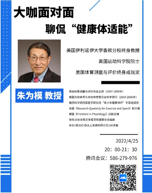 4月25日晚,由上海体育学院运动科学学院主办、体适能教学团队承办的国家一流本科课程建设活动——大咖面对面聊侃“健康体适能”活动顺利举行。本次活动有幸邀请到美国伊利诺依大学香槟分校终身教授、美国运动科学院院士、美国体育测量与评价终身成就奖得主——朱为模教授作为主讲嘉宾,有来自上海体育学院、上海师范大学、同济大学、复旦大学、哈尔滨师范大学、哈尔滨体育学院、华侨大学和宁夏大学等十余所院校的五百多名师生参与,活动由上海体育学院运科学院庄洁教授主持。
