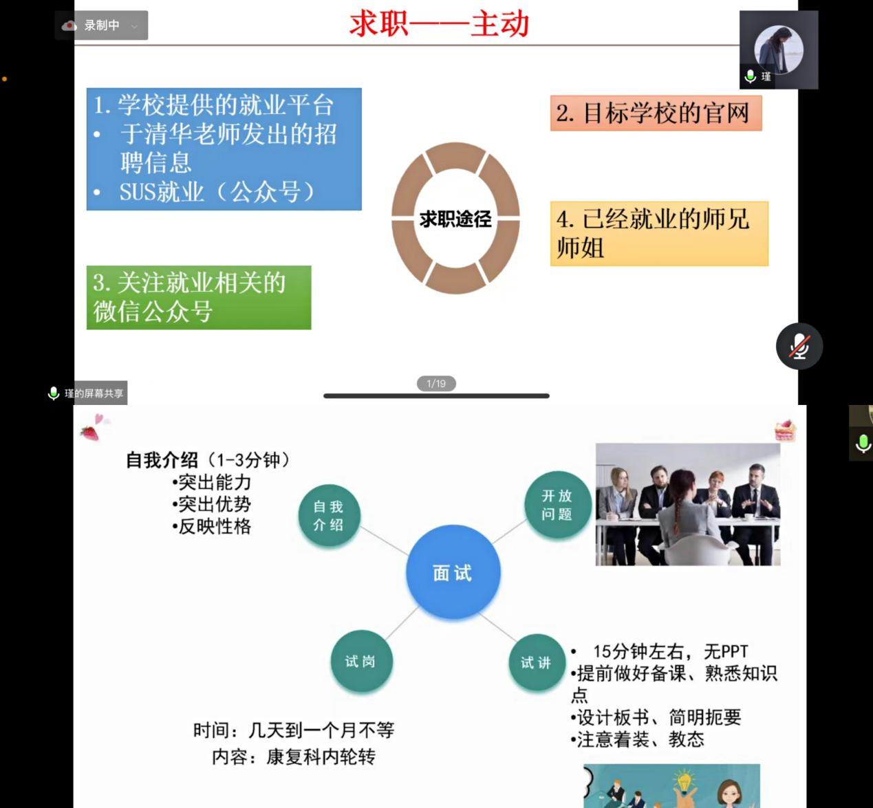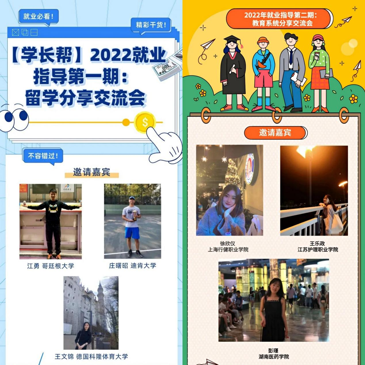 基于当前上海疫情的严峻形势,为促进毕业生就业,提高竞争力,拓宽毕业生就业思路,树立正确就业观。2022年4月-5月,学院研究生分会举办了五期学长帮就业分享系列活动,每期邀请2~4名优秀校友作就业分享,包括出国留学、教育系统、医疗系统、公务员及事业编制单位、体育学相关企业等方向,通过分享与问答等多种形式,为毕业生求职过程中存在的问题进行答疑解惑,充分发挥运科学院研究生“传、帮、带”的学长制朋辈教育作用。