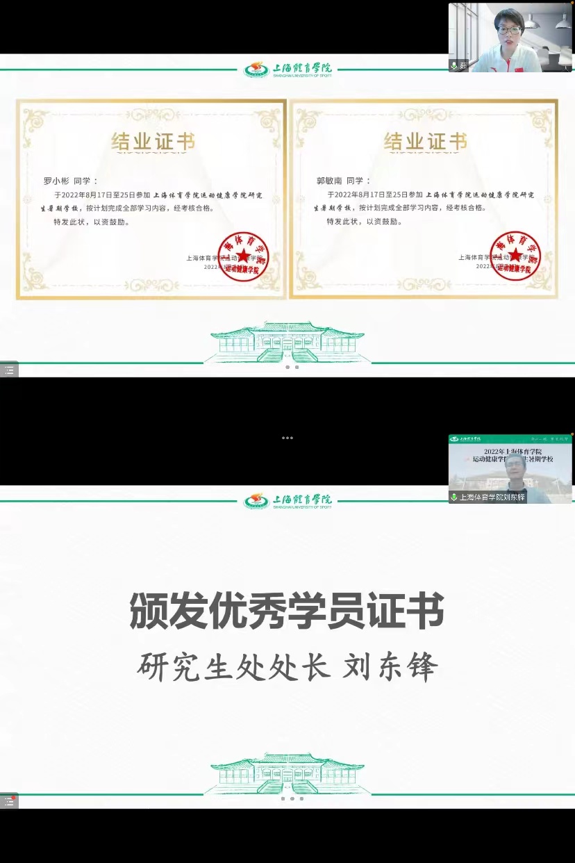 8月17日-26日,由上海体育学院研究生处和ok138cn太阳集团古天乐主办的“体卫融合”——2022年上海体育学院ok138cn太阳集团古天乐研究生暑期学校在线上举行。26日上午举行闭幕式,上海体育学院校长陈佩杰,研究生处处长刘东锋、ok138cn太阳集团古天乐院长王茹、党委书记熊静、副院长于新凯出席此次闭幕式,闭幕式由ok138cn太阳集团古天乐党委副书记、副院长陈莉莉主持。