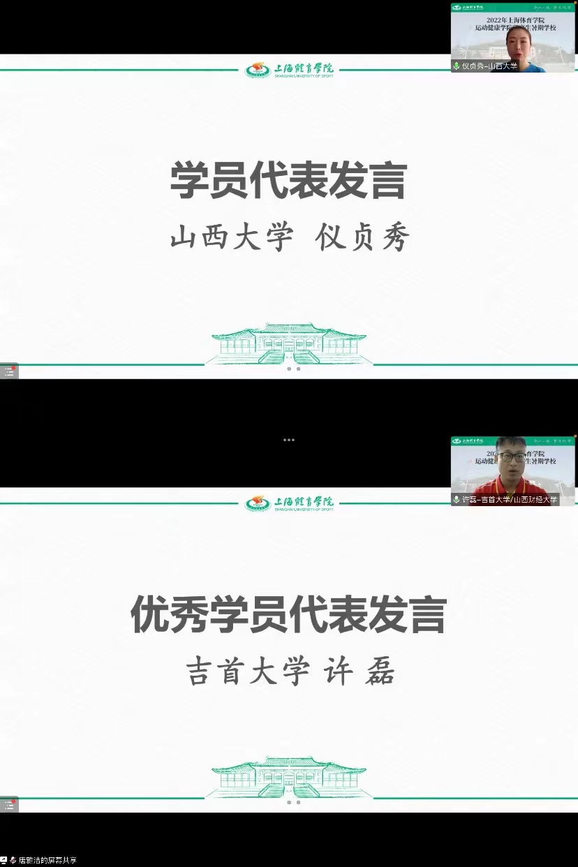 来自山西大学的硕士研究生仪贞秀和来自吉首大学的博士研究生许磊作为学员代表发言,他们对本次暑期学校为全国学子搭建的高质量学术交流平台表示真诚的感谢。其中,许磊同学在11年间分别以硕士、青年教师、博士的身份三次参加上海体育学院举办的暑期学校活动,他的实践之路充分体现了学术研究者求真、务实的精神。