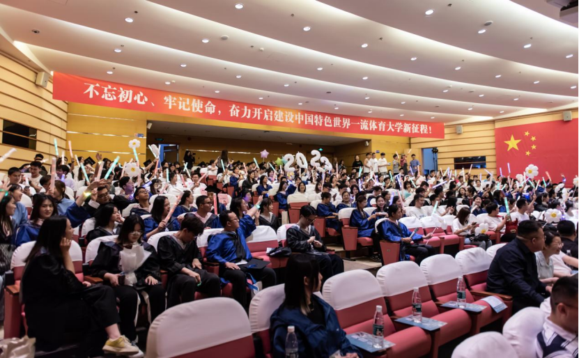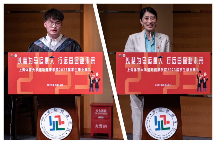 依依惜别,万语千言。本科毕业生曹海鹏、博士研究生毕业生陈楠作为学生代表进行了发言。从刚入校园的懵懵懂懂到如今的成熟稳重,曹海鹏分享了他的青春故事,表达了对学校和老师的感谢和对校园生活的不舍,并希望同学们能永葆初心,归来仍是少年;陈楠则通过分享自己在上体求学数载的学习体会,强调了在上体培养的乐观向上、积极面对困难、坚持奋勇拼搏的体育精神,她也鼓励所有毕业生牢记“身心一统、兼蓄竞攀”的校训精神,无论坦途还是逆境,都能勇敢做自己。