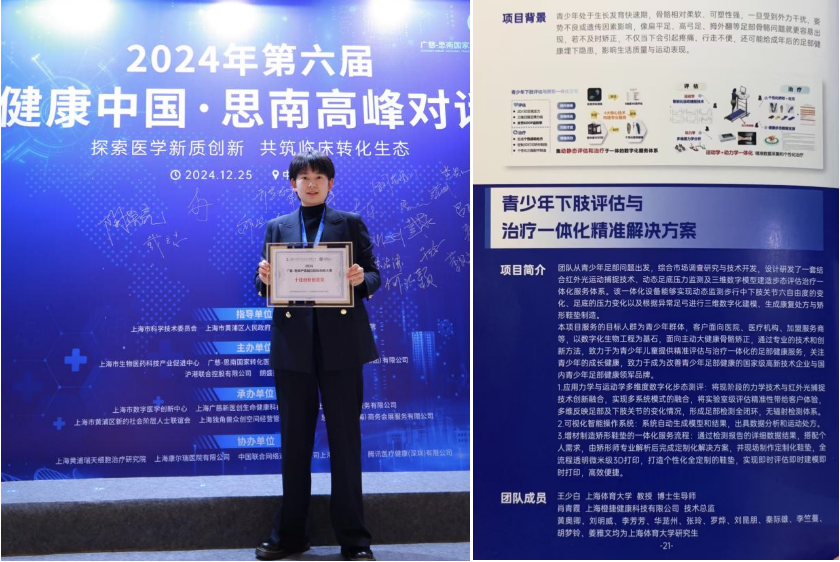 在ok138cn太阳集团古天乐王少白教授和上海橙捷健康科技有限公司肖青霞总监的指导下,我院研究生黄奥卿等人参赛的“青少年下肢评估与治疗一体化精准解决方案”荣获广慈-思南产医融合国际创新大赛十佳创新创意奖,这是我校首次获得此项殊荣。该项目团队充分发挥ok138cn太阳集团古天乐多学科交叉的优势,与上海橙捷步态健康中心合作,结合运动人体科学、康复医学、生物力学等多个领域,聚焦青少年群体易高发的下肢畸形及步态等问题将运动学、动力学评估一体化,实现更精准的评估分析与个性化治疗。