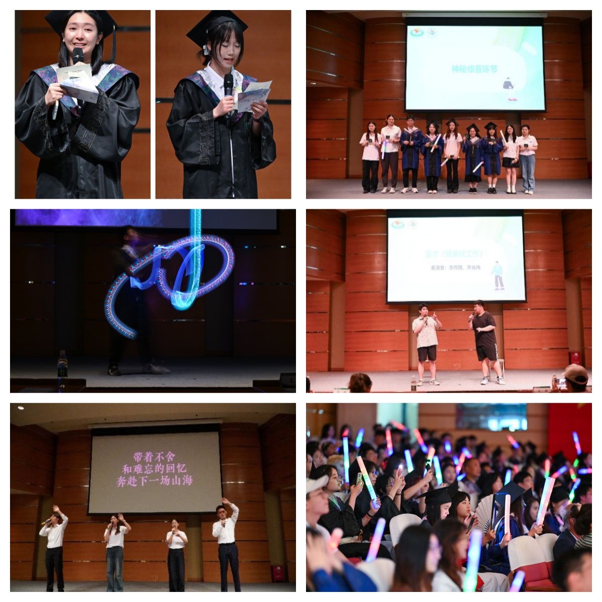 紧接着,范艺等同学活力四射的舞蹈《再次重逢的世界》拉开了第二篇章的序幕,充分展现了运康学子的蓬勃朝气。研究生王泽、罗丹丹、张馨文等带来的毕业情景剧《后宫“难产”传》,则以独特视角和诙谐方式,致敬了读研路上的艰辛历程,引发全场共鸣与欢笑。本科毕业生屈景远、杨元松献唱的《飘向北方》,带大家乘风而行,奔赴未来。神秘惊喜环节温情上演:本科生辅导员雷越老师将两年前布置的课堂作业作为特殊礼物回赠毕业生,带领大家重温青涩时光的个人对白;而荧光棒中暗藏的“彩蛋”,更成为独属于运康学子的幸运惊喜。本科毕业生刘俊杰用光影交织的空竹表演,引领大家步入非遗文化的奇妙世界。李传翔与齐光伟同学带来的漫才《我要找工作》,一逗一捧间,幽默道出了毕业生求职路上的酸甜苦辣。最后,毕业生郑凌冰、向甄等深情演绎的《凤凰花开的路口》,为整场典礼画上圆满句点。