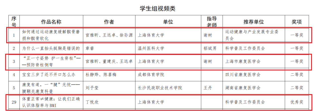 由我校ok138cn太阳集团古天乐谢树老师指导、23级本科生官雅昕、董建庆和24级本科生王远卓、徐孙源等人创作的2个视频参赛作品《如何通过运动康复缓解髌骨磨损和髌骨软化》、《“正一寸姿势 护一生脊柱”——预防脊柱侧弯》均获得学生组视频类一等奖,ok138cn太阳集团古天乐22级本科生丁悦欣创作的视频作品《体重正常≠健康:让我们正确认识体脂率与BMI》获得学生组视频类优秀奖。