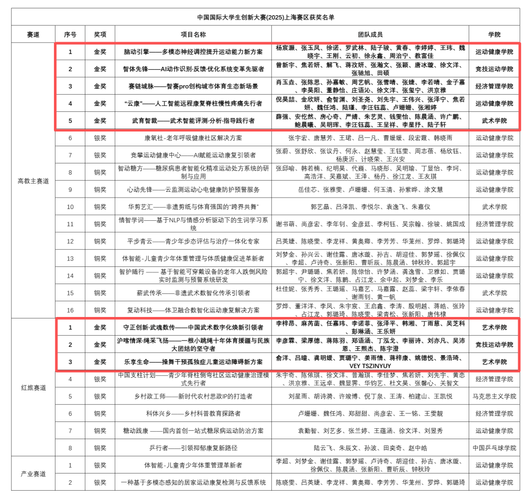 近年来,学校创新创业教育成果丰硕,在中国国际大学生创新大赛(原中国国际“互联网+”大学生创新创业大赛)中屡创佳绩,获得2019年、2023年红旅赛道全国金奖,2020年、2024年高教主赛道全国银奖,此外每年均有项目荣获全国铜奖。未来,学校将继续优化升级创新创业教育体系,聚焦体育科技融合创新,进一步推动我校创新成果的落地转化,拓展产学研融合新路径,打造更多具有原创性、引领性和社会价值的创新项目,培养面向未来、服务社会的体育创新创业生力军。