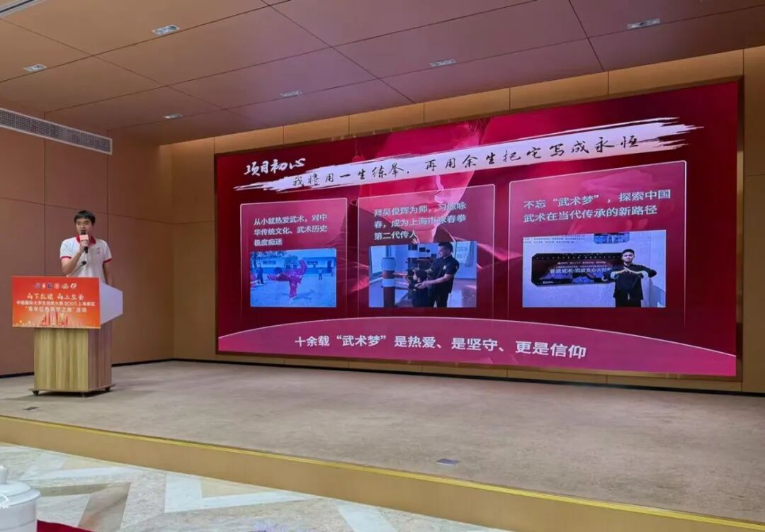 今年,我校还承办组织了中国国际大学生创新大赛(2025)上海赛区“青年红色筑梦之旅”活动。活动以“向下扎根 向上成长”为主题,汇聚全市高校的优秀红旅项目。我校项目《守正创新 武魂数传—中国武术数字化焕新引领者》作为全市两个优秀红旅展示项目之一,代表学校进行成果交流与展示,进一步提升了学校在该赛道的影响力。