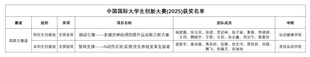 10月12日至15日,中国国际大学生创新大赛(2025)全国总决赛在郑州大学举行。我校共有10个项目入围国赛,其中《脑动引擎——多模态神经调控提升运动能力新方案》和《智体先锋——AI动作识别·反馈·优化系统变革先驱》两个团队成功晋级全国总决赛现场赛。经过激烈角逐,《脑动引擎》项目在高教主赛道斩获金奖,实现了我校在该项顶级赛事主赛道金奖“零”的历史性突破,同时,这也是全国体育院校在该赛事主赛道研究生组别的首个全国金奖,《智体先锋》项目荣获银奖。此外,我校还获得8项铜奖,奖项数量与质量均创历史新高。截至目前,我校已在该项赛事上累计斩获国家级奖项24项(3金、3银、18铜),位居全国体育类高校首位。