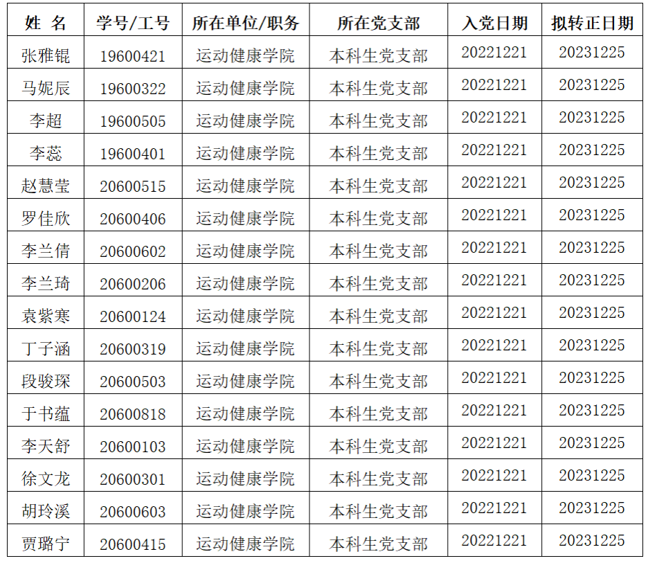 经过党组织的进一步教育和考察,以上16位中共预备党员基本符合正式党员条件,准备转为正式党员,特此公示。公示期为七天(2023年12月16日—2023年12月22日),各单位或个人如有意见,可通过来电、来访、来函等形式反映。