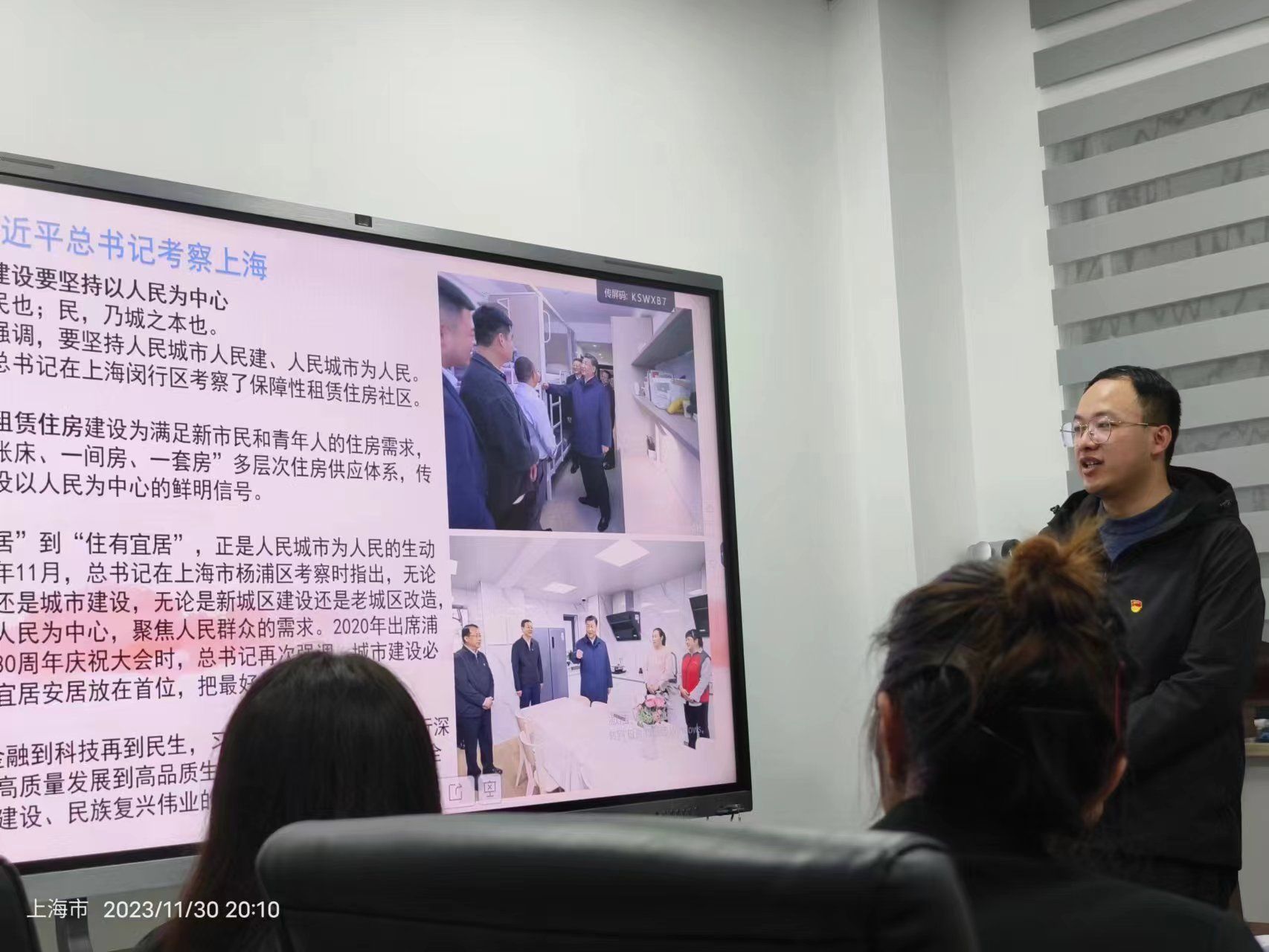 会上,全体党员一同观看了习近平总书记在11月28日至29日考察上海期间的新闻短片报道。