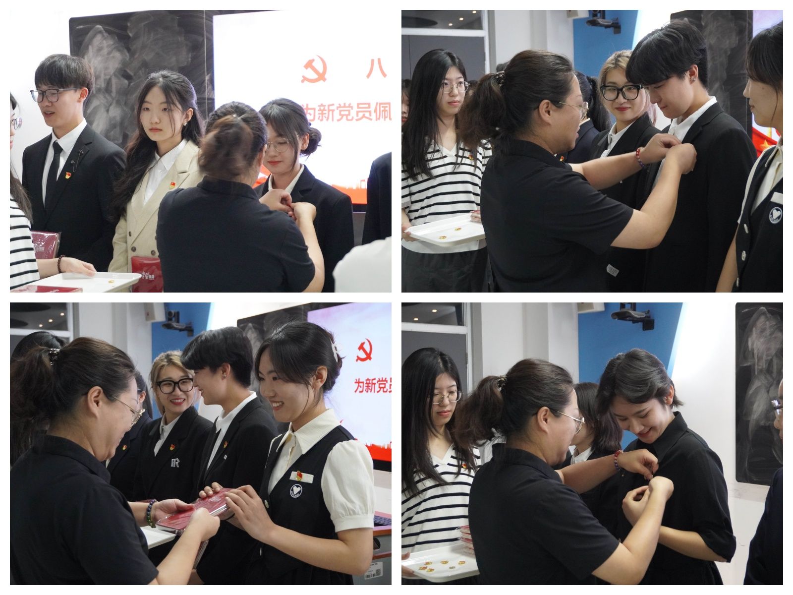 在大会决议宣布之后,学院党委副书记严芳同志为新同志们逐一佩戴了党徽,并赠送了学习笔记本。