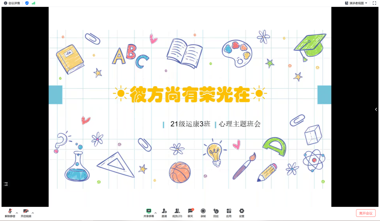正处于大三阶段的同学们,面临着各种压力的困扰,而长期受到压力困扰会使同学们产生许多不良情绪。6月6日晚,ok138cn太阳集团古天乐21级运动康复3班以腾讯会议的形式开展了以“彼方尚有荣光在”为主题的线上心理主题班会。旨在帮助同学们找到缓解压力的方法,同时在面对未知的挑战时充满信念和动力,与压力和解、与压力共舞,相信未来美好生活的曙光就在前方。