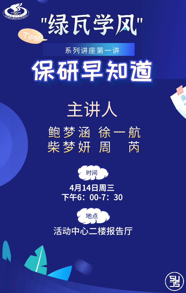 关于考研保研相信你在本学院一定了解不少内容,本次“绿瓦学风”系列讲座活动将会邀请我校不同专业的高分研究生以及跨专业考研的优秀研究生学子为你分享考研保研经历,为你带来更全面更综合的考研视听盛宴,更有机会与优秀研究生代表及考研小伙伴交流备考的经历,从此备考之路不再迷茫,不再孤单~