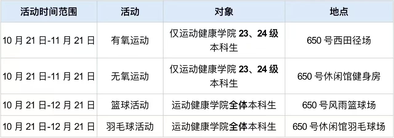 在10月21日-11月21日的每周一至周五6:30 - 7:30,我们开展了以下活动: