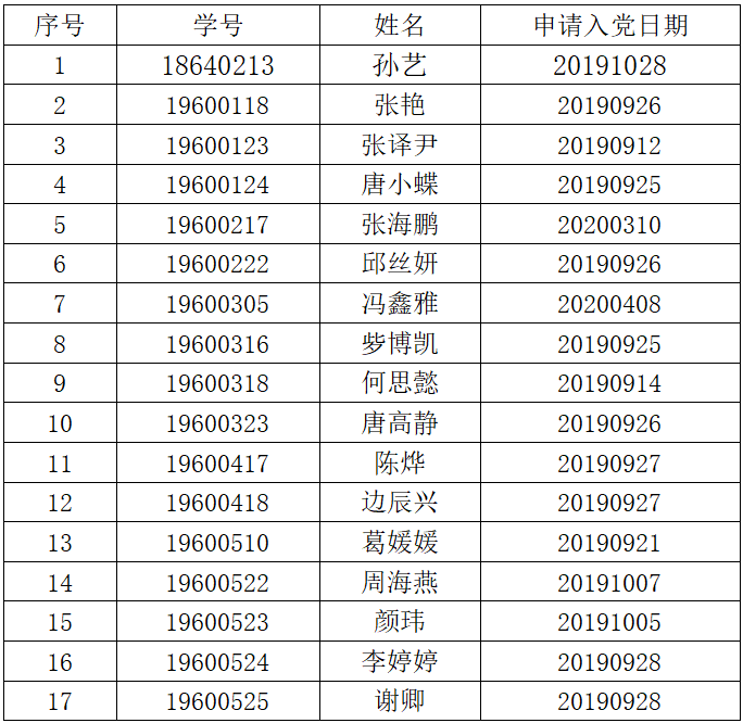 运科学院团委根据上海体育学院团委《上海体育学院推荐优秀团员作入党积极分子人选工作实施细则》的文件要求,在广大团员群体中积极开展推荐优秀团员作入党积极分子人选工作。经各团支部召开团支部全体会议,各支部团员本着公开、公平、公正的原则投票,学院团委委员会审核,认为以下同志符合推荐条件,现将名单公示如下: