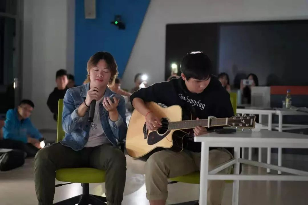 游戏结束后,陈泽铖学长和蒙玮靖学长给我们带来了歌曲《夜空中最亮的星》和《追梦赤子心》。在现场,大家打开手电筒,随歌摇摆,在唯美的灯光中合唱。