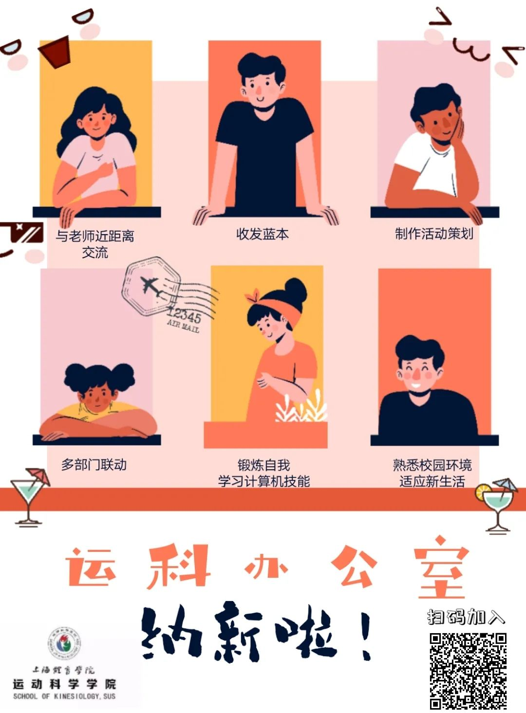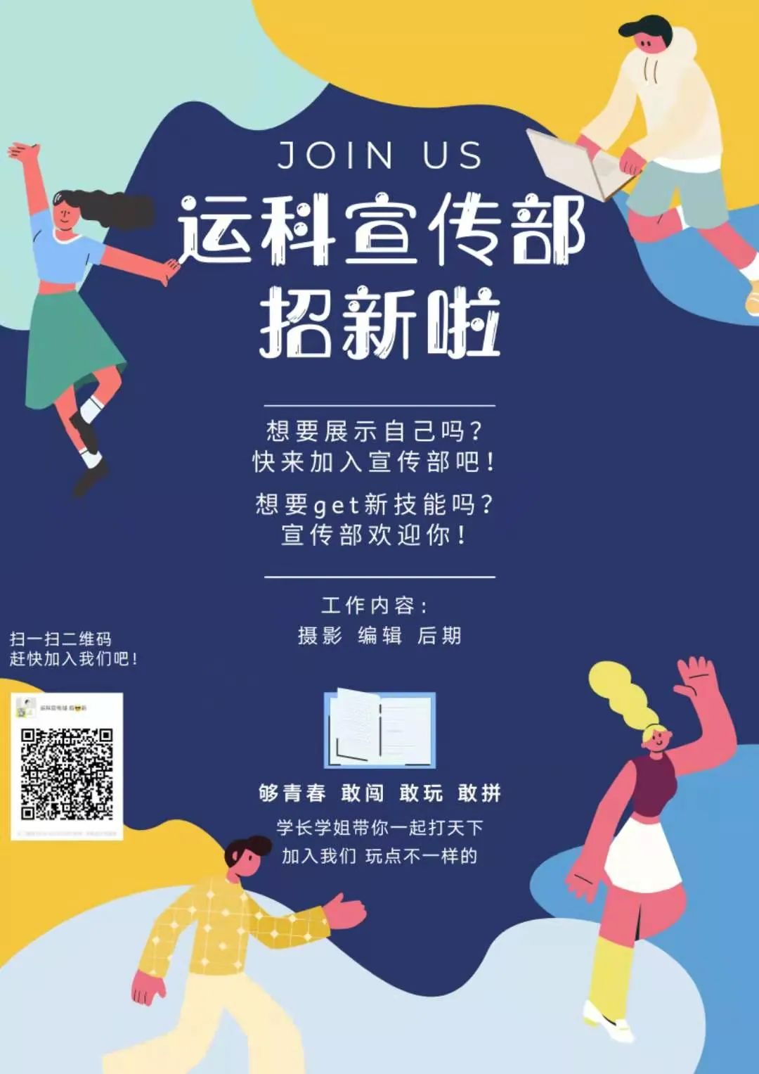 大一的空闲时间很多,不如加入宣传部让生活充实起来吧!加入我们,你可以——成为运科的发言人,向外宣传上体运科;及时掌握前沿资讯,结识优秀的同学和可爱的老师;学习新媒体技能,包括但不限于摄影、摄像、后期制作,文案编辑、推送排版、公众号运营。各种随机福利和好多好多加蓝本的机会!